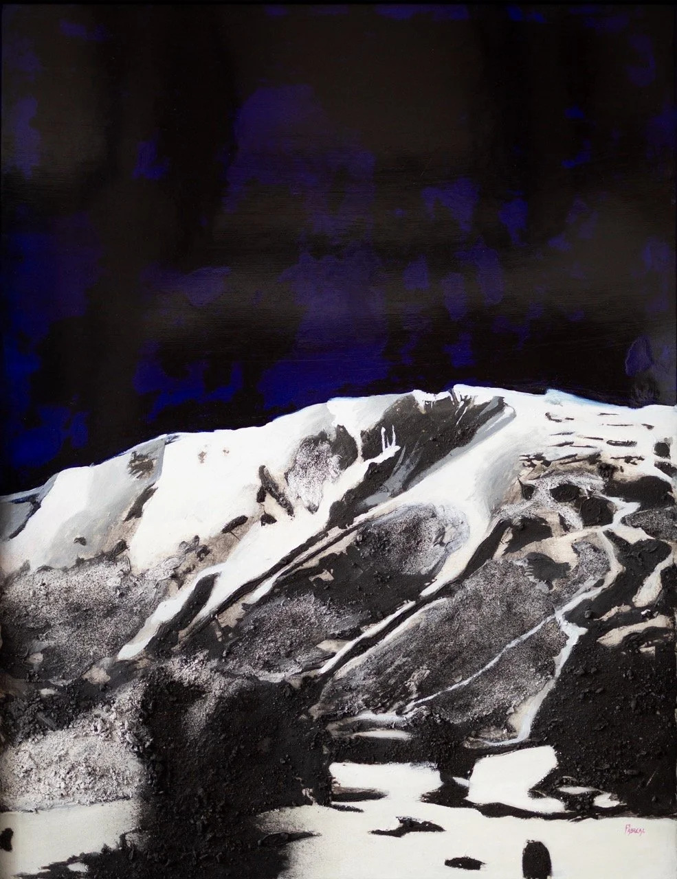 •ALAIN FABREAL• s’exprime sur l’espace et la grandeur infinie d’un territoire vierge, ouvert sous le ciel abandonné. Sous cette voûte noire des cieux, la chaîne blanche des montagnes. Sous la lueur d’une lune absente, des ombres noires, des arbres et des rochers sont projetés sur la neige. Ce sujet contient pour lui une dimension à la fois intime et suprasensible car de la Montagne Magique surgit toujours la providence.