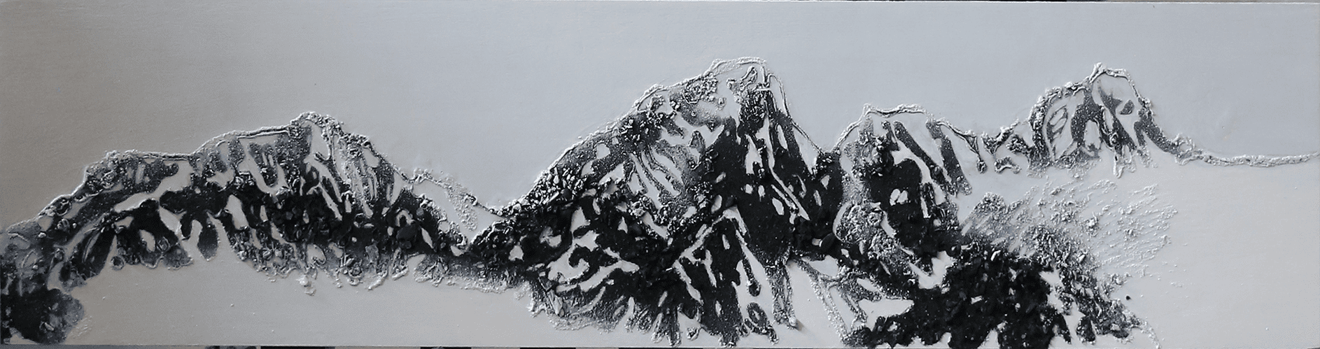 Sont présentés également des dessins réalisés à la mine de plomb et au fusain compressé sur papier, où le geste direct et la précision du trait permettent de saisir l’essence des reliefs, la vibration des ombres et la structure intime des paysages. À côté de ces œuvres graphiques, les peintures à l’huile mêlées au charbon de bois déploient une matière plus ample, où les contrastes entre la profondeur du noir et l’éclat du blanc de la neige structurent l’espace.