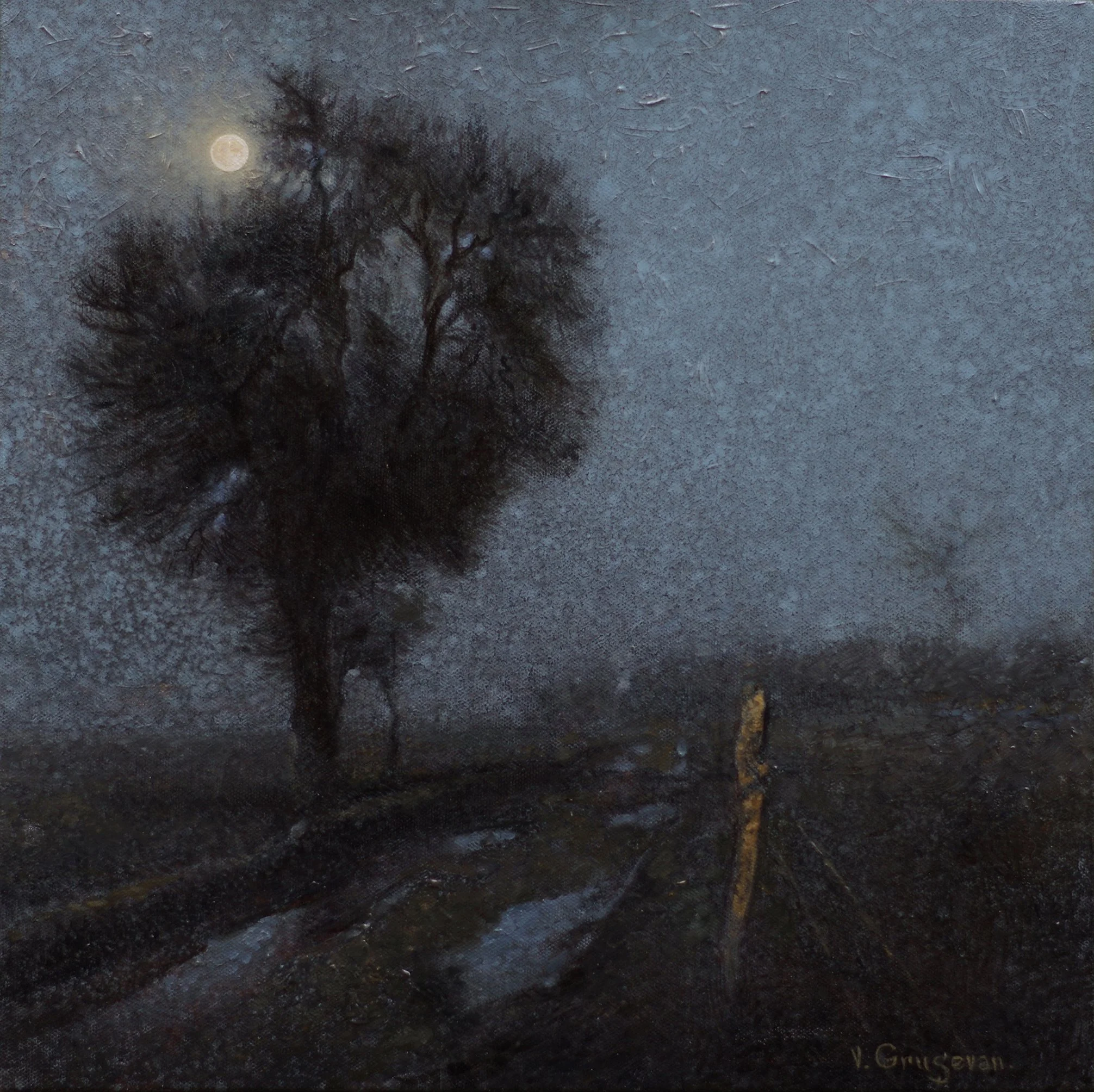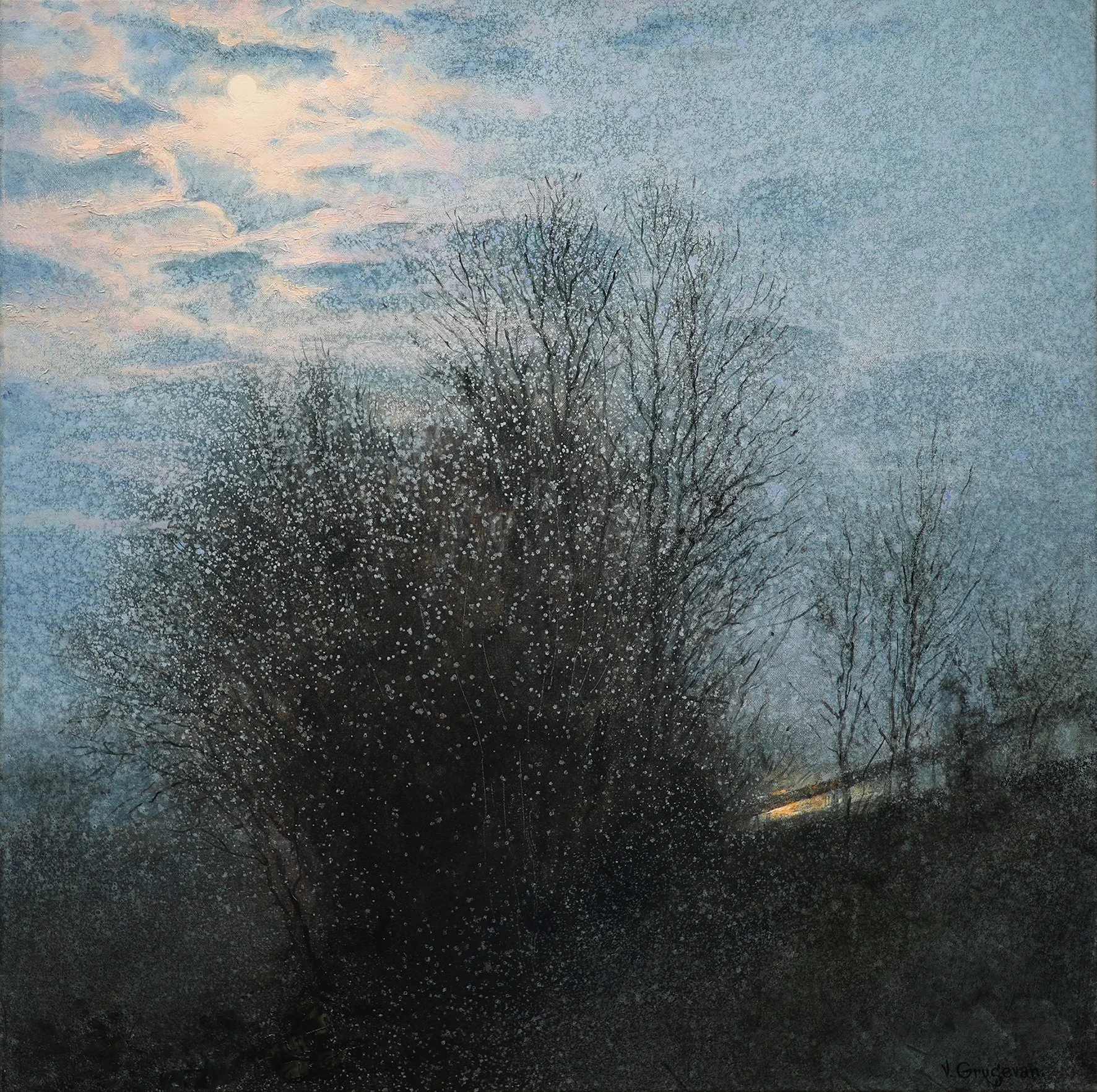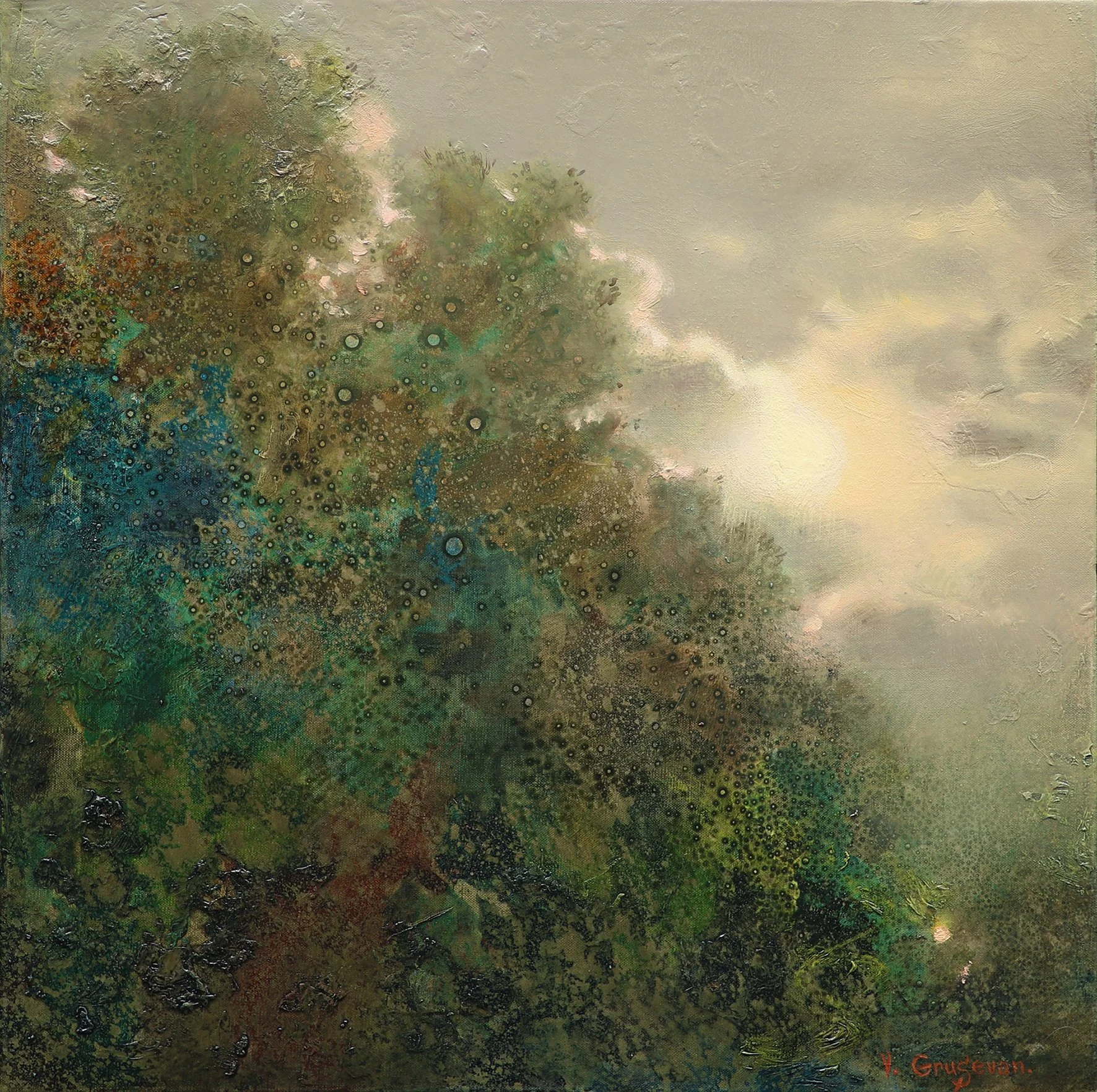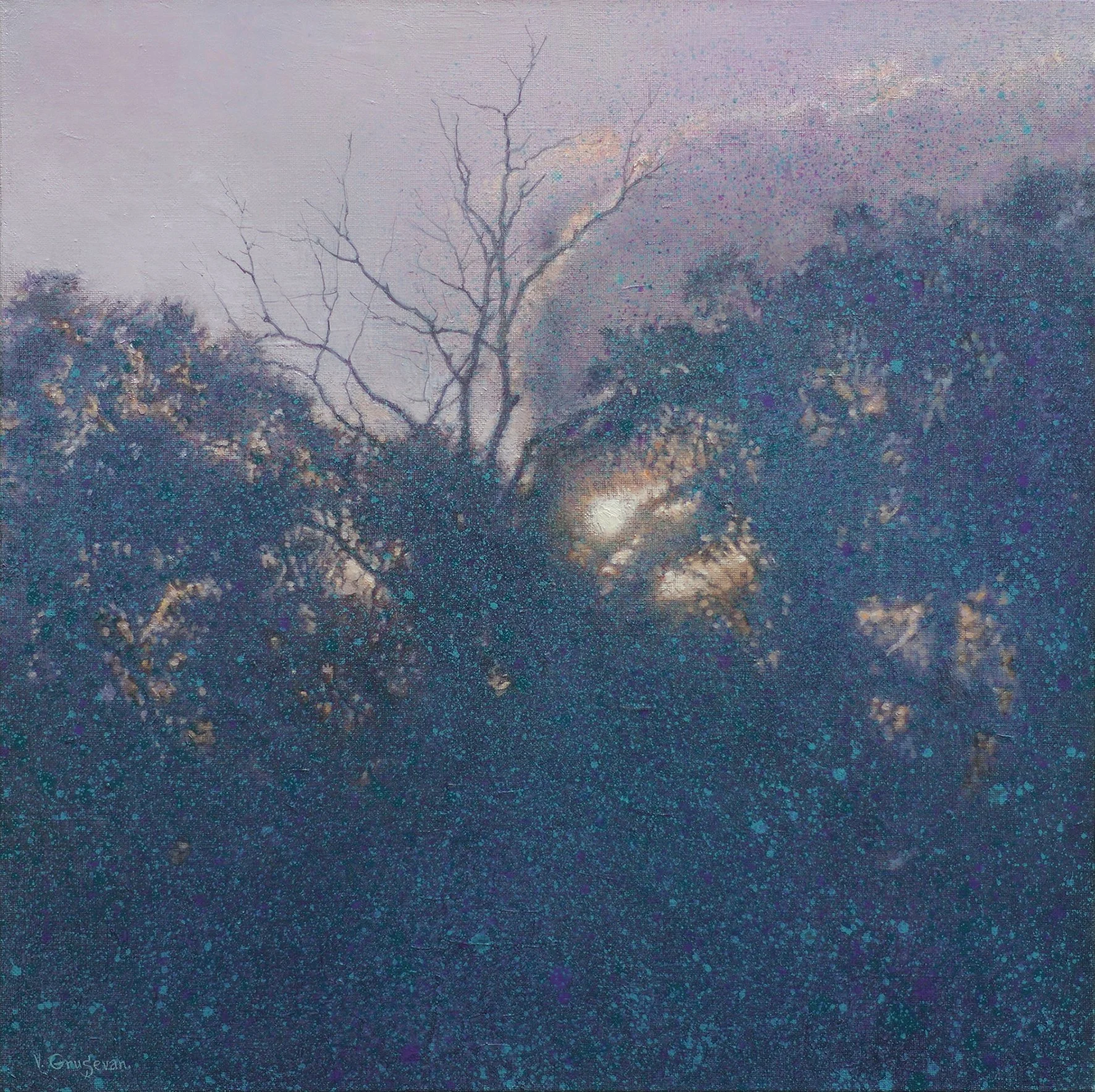 Dans ces œuvres, la lumière semble filtrée, diffuse, presque retenue. Les paysages apparaissent comme suspendus, hors du temps, à la lisière du visible et de l’invisible. V. GRU$ joue ainsi avec les limites de la figuration, frôlant parfois l’abstraction sans jamais s’y perdre totalement.